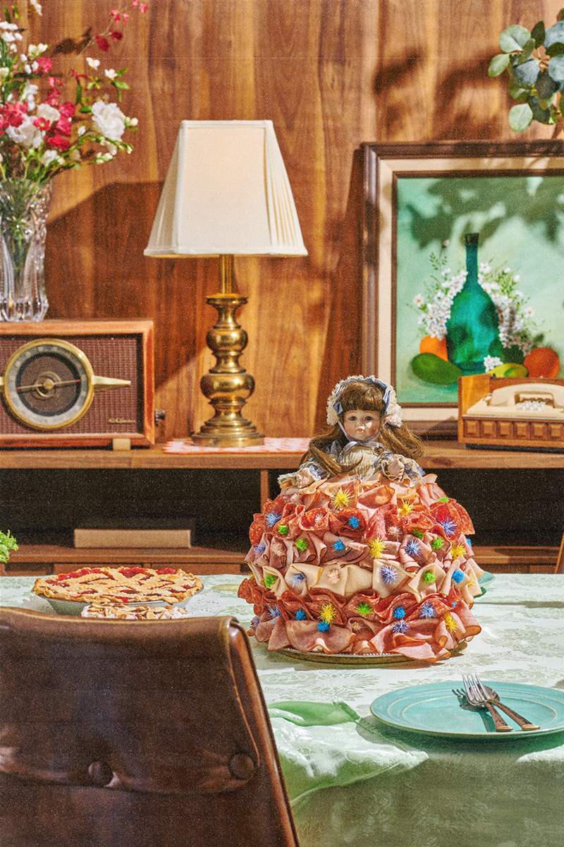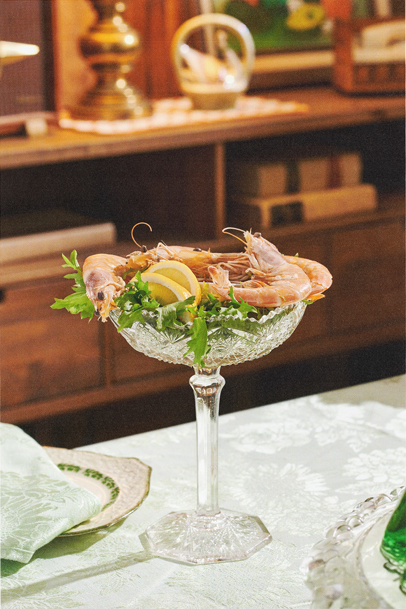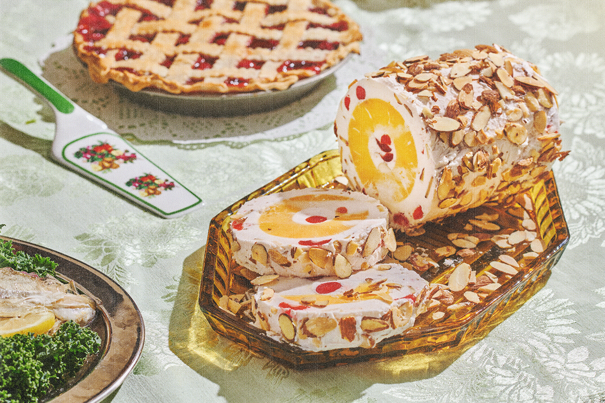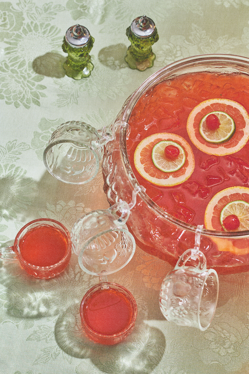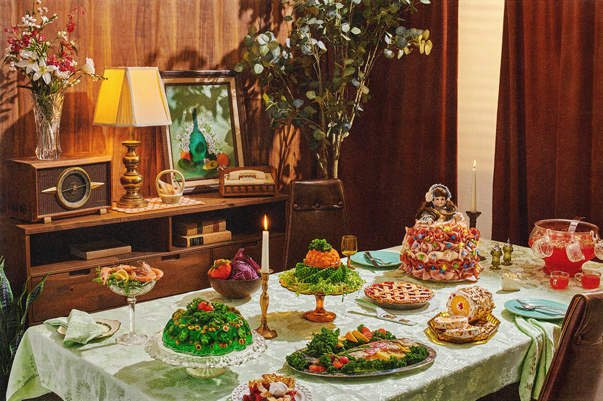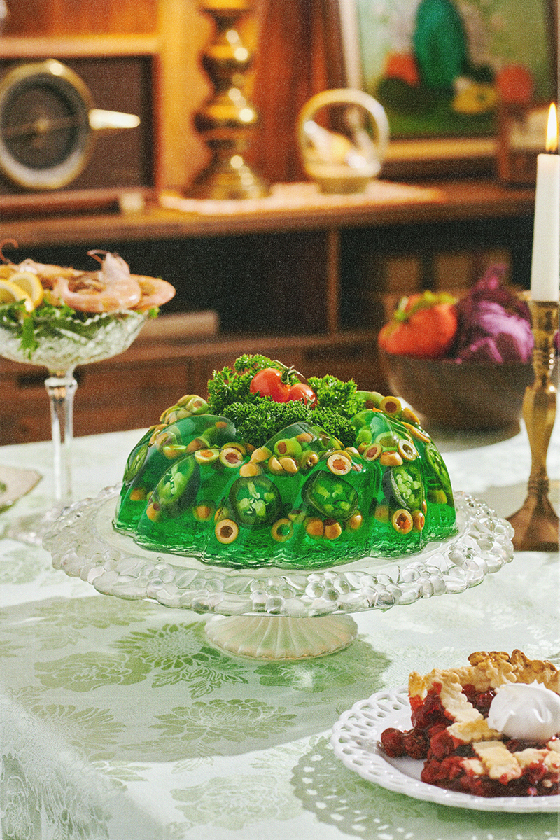 Prop stylist Lisa Ornelas curated period-specific props to design a nostalgic set ready for party goers, and food stylist Amanda Anselmino worked with recipes from old cookbooks to create an array of playful Jello-based dishes.