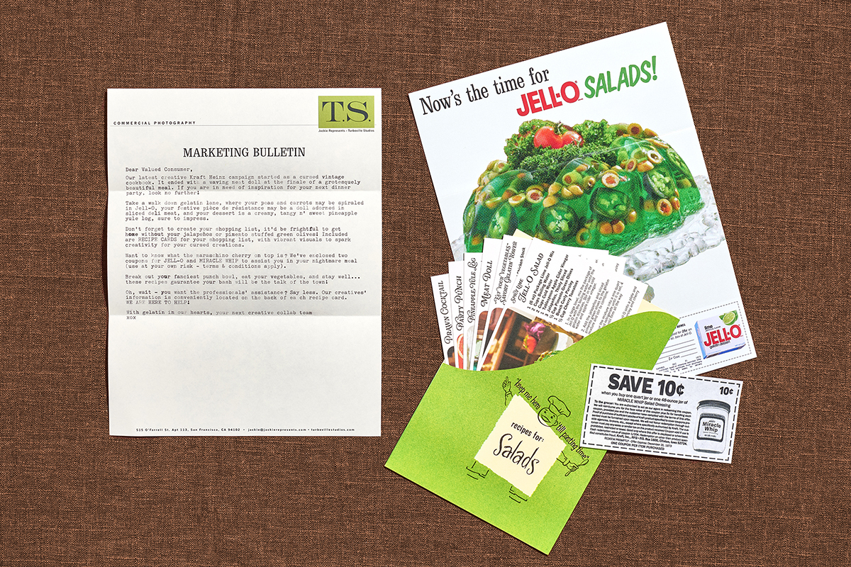 I worked with designer Joseph Casey to turn the images into a printed promo reminiscent of the things you’d find in vintage recipe keeper binders; recipe cards, a magazine advertisement for Jello, Miracle Whip coupons, and a “marketing bulletin” that was hand typed on a typewriter, addressing the recipient with a summary of our project framed as a mid-century marketing promo for Jello and Miracle Whip. The risograph folders the printed components were compiled into were a reproduction from a thrifted 1960’s recipe keeper I own.