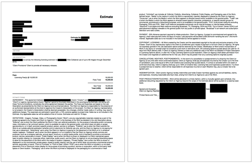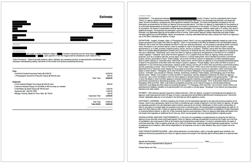 Equipment: I included $1,000 per shoot day for the photographer’s own camera, grip, and lighting gear.
